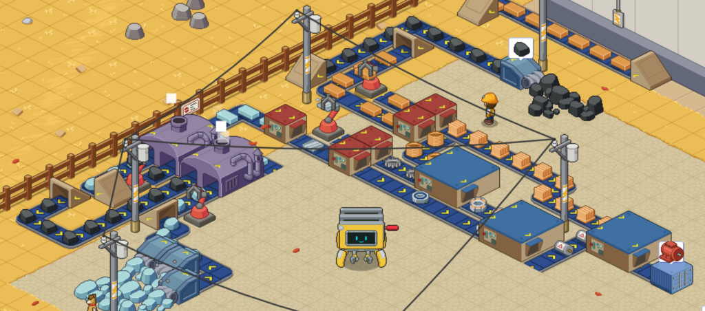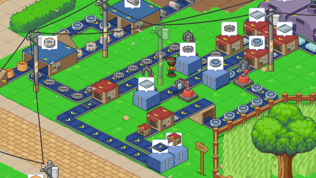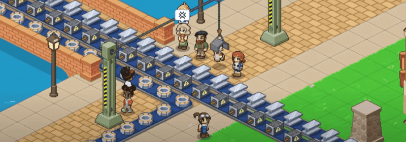 Stardew Valley também tem essa função interessante de podermos usar partes da cidade ou áreas fora da fazenda para plantar árvores. My Little Rocket Lab leva isso ao extremo: como na maioria dos objetivos temos que entregar milhares de itens para algum lugar, temos que usar esteiras para transportar esses recursos pela cidade toda. O problema é que os NPCs (que também têm suas rotinas) não conseguem passar por cima dessas esteiras e ficam travados se tiver alguma no caminho. Para contornar isso, o jogo deixa criarmos passarelas subterrâneas. Então, temos que otimizar muito bem e saber usar todos os cantos da cidade para não atrapalhar a rotina dos habitantes.